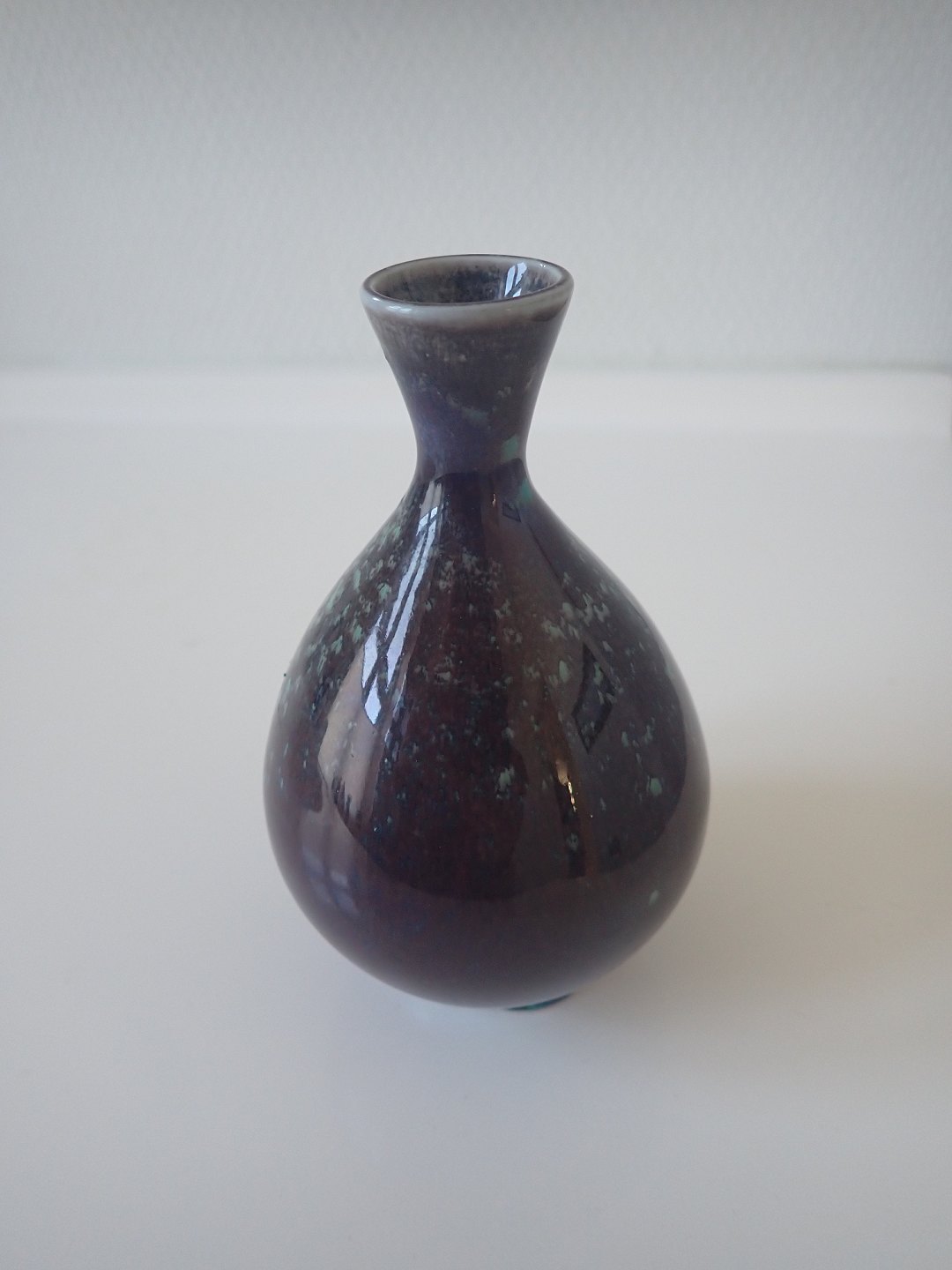 Berndt Friberg (1899 - 1981) - Lille, dråbeformet vase i stentøj med blank grøn/brun/blå spættet glasur. Gustavsberg. Stemblet Friberg 79. Højde: 11,7 cm. Bredde: ca. 7 cm. I fin stand men med oprindelig sleben bund.