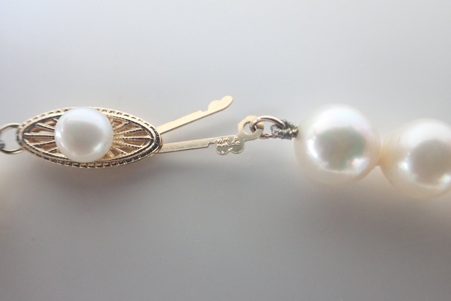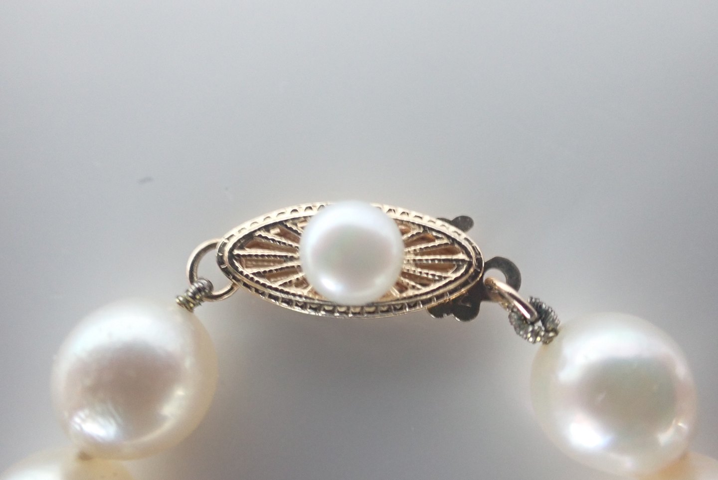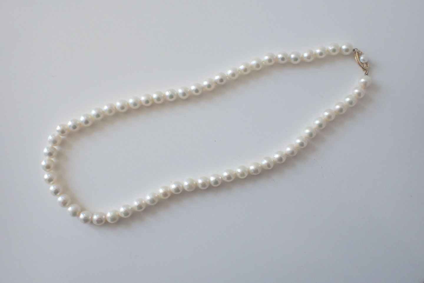 Perlekæde med lige store saltvandskulturperler og med guldlås.