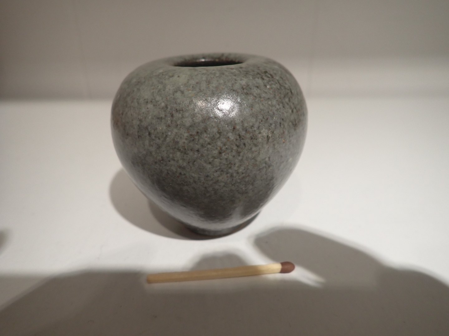 Saxbo miniaturevase med gråsort, spættet glasur. Buttet med lille åbning. Mærket Yin Yan Danmark og et utydeligt enkelt V eller W, måske et drejermærke. Formentlig Eva Stæhr-Nielsen (født Wilhjelm). Højde: 6,4 cm. - bredeste mål: 6,9 cm. I fin stand