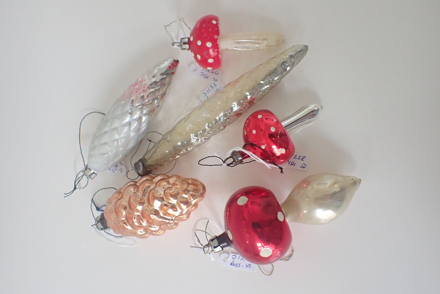 3 stk. kogler. Med ophæng: 2 lange sølvfarvede russiske - 9,2 - 13 cm. og en bronzefarvet tysk, 8,2 cm. Omkring 1940. Priser fra 85 -200 kr. 3 paddehatte med rød, hvid og sølv bemaling. i forskellige størrelser. Priser fra. 85 - 200 kr.